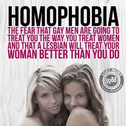 Homophobia: The fear that gay men are going to treat you the way you treat women and that a lesbian will treat your woman better than you do!
